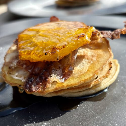 - Auf einem Teller je drei Pancakes stapeln, darauf je eine Scheibe Bacon und Orange drapieren und mit einem guten Schuss Ahornsirup übergießen.
